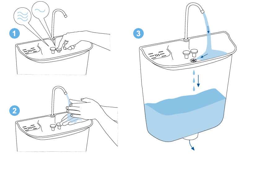 Vraťme se ještě k WC. V malých místnostech se často bojuje s prostorem pro WC a umyvadlo. Pokud použijete umyvadlo na WC nádržku, ušetříte prostor, i vodu. Nebudete využívat vodu samostatně pro mytí rukou, a samostatně pro splachování. Vodu, kterou si umyjete ruce, totiž použijete následně při splachování. Je to úsporný, ekonomický a ekologický způsob využití pitné vody. Voda přitéká přes baterii do umyvadla, ve kterém si můžete umýt ruce, a tato, již použita voda, nateče do WC nádržky. Toto je další příklad, jak využívat vodu s rozumem.